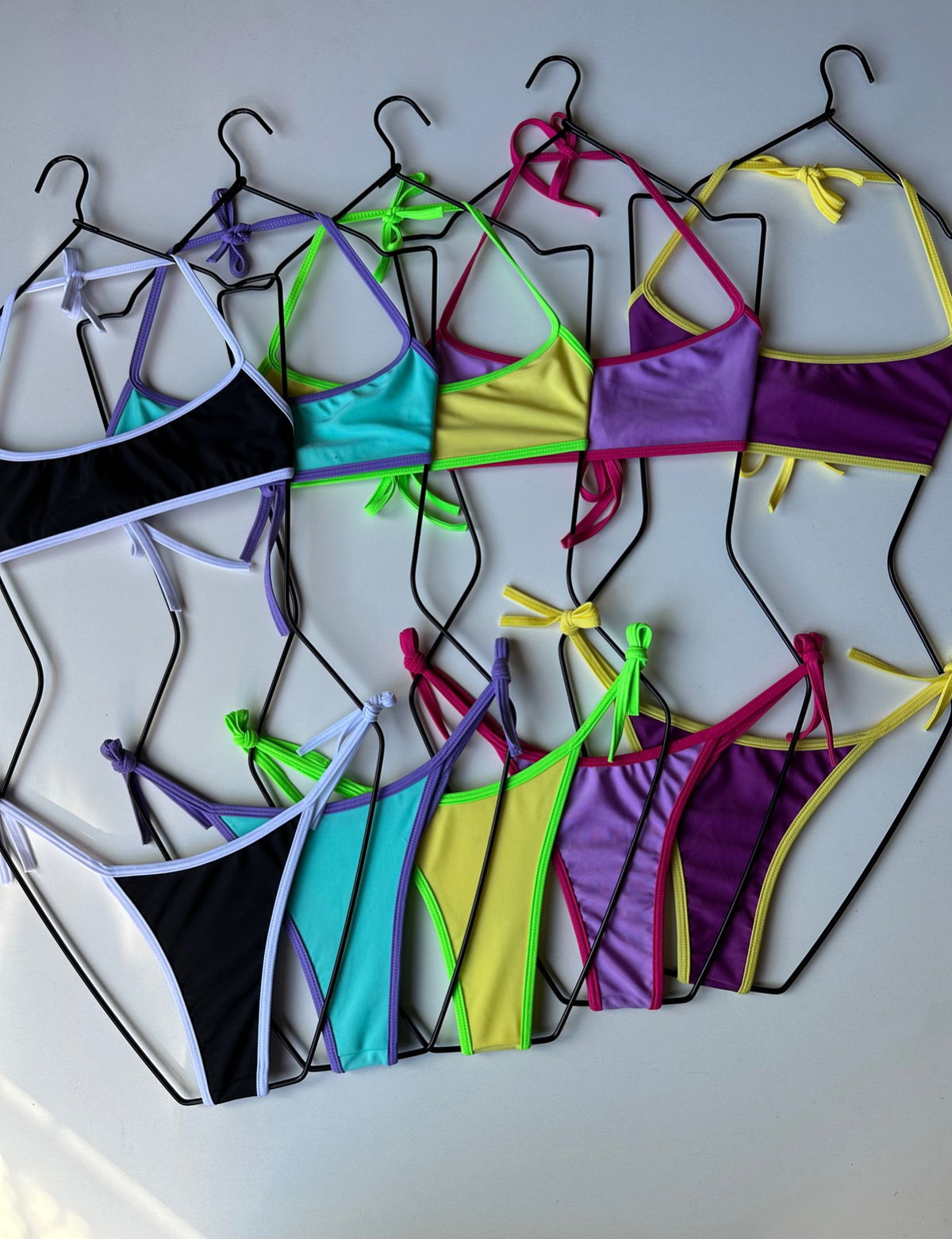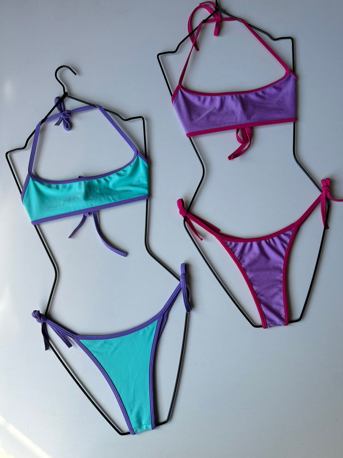 Bikini triangulo fijo de licra con argollas y breteles regulables.