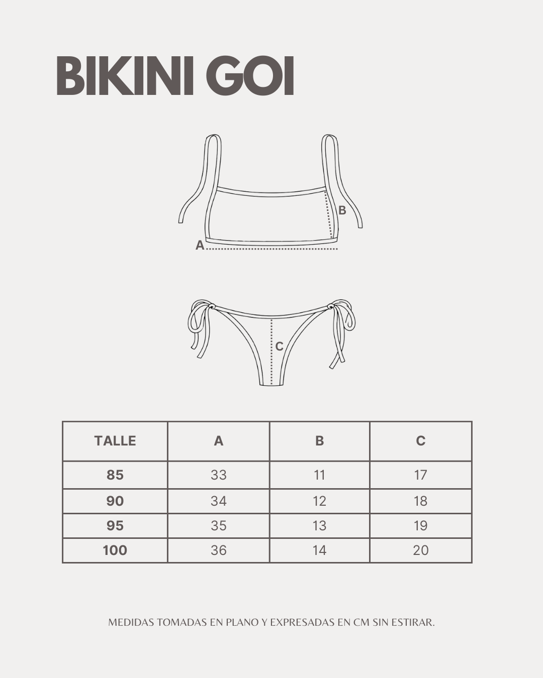 Bikini recta con tiras para atar al cuello y espalda. Colaless de corte clásico para atar.